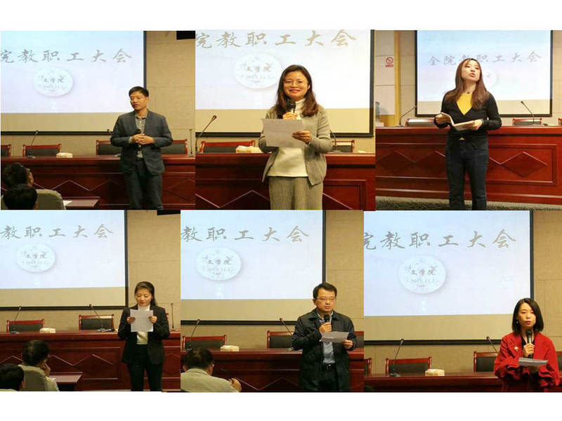 紧接着,参与职称申报的六位教师先后上台进行述职。本次申报教授的有杨旭辉老师和张蕾老师,申报副教授的有李一老师、杨黎黎老师、陈昌强老师和姜晓老师。六位老师用简洁的语言总结了个人的主要成就与思想政治情况。