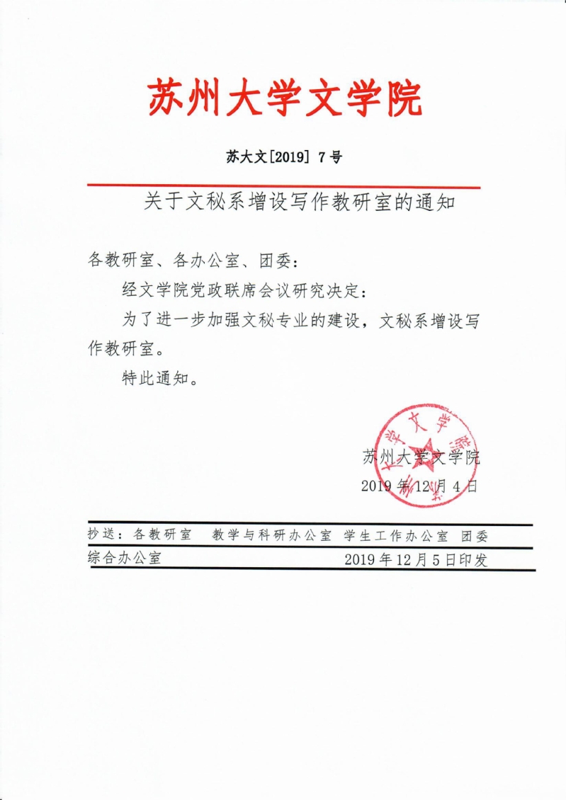 关于文秘系增设写作教研室的通知