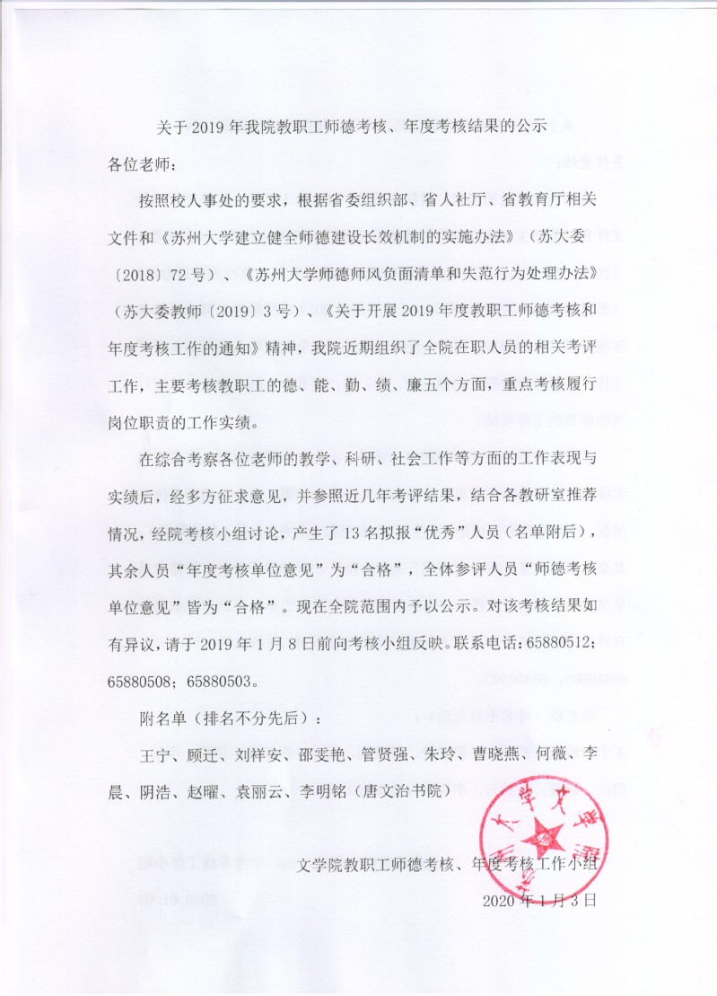 关于2019年我院教职工师德考核、年度考核结果的公示